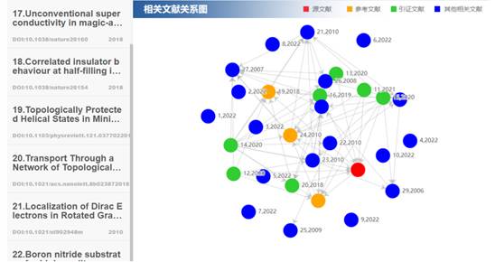 四、以论文查论文:寻知通过分析文献之间的引用关系、共现关系、耦合关系,从一篇具体的论文出发,挖掘出更多与该论文相关的重要文献和前沿文献,并可视化呈现这些文献之间的引用关系,帮助读者快速定位该课题的重要文献,发现研究基础、研究热点、研究前沿等,为科研选题、文献综述等提供更为全面的研究背景。