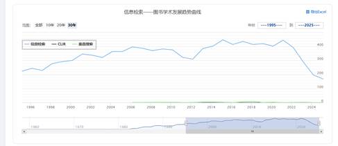 多主题对比图可查看图书/期刊/学位论文/会议论文/专利/标准/报纸等学术趋势图。趋势图可以选择10、30、50年代展示,同时都可以进行数据的导出,方便用户使用。